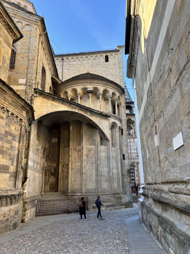 Schodzimy na dół. Inni zjeżdżają. Spotykamy się przy bramie. Wchodzimy do centralnej części starego miasta. Zatapiamy się w uliczkach citta Alta. Cudowne. Pełne tajemnic. Trafiamy na budynek szkoły znajdujący się w renesansowych zabudowaniach miasta. Basilica di Santa Maria Maggiore. Katedra Duomo di Bergamo e Battistero. Piazza Vecchia wita nas pełnym słońcem i zapachem kawy. Postanawiamy odpocząć chwilę na kawie. To jest prawdziwa dolce vita.