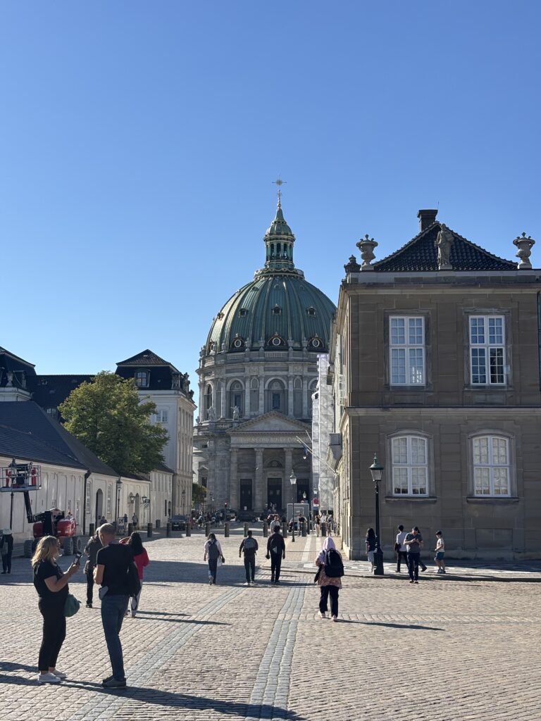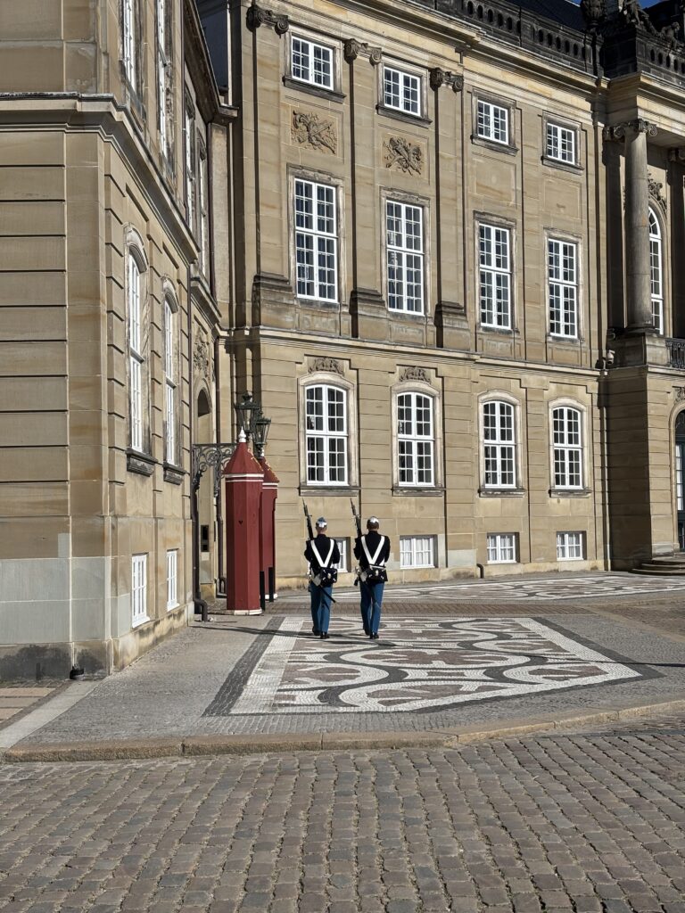 My wędrujemy do centrum Kopenhagi. Amalienborg Palace. Miejsce gdzie rezydują królowie duńscy.