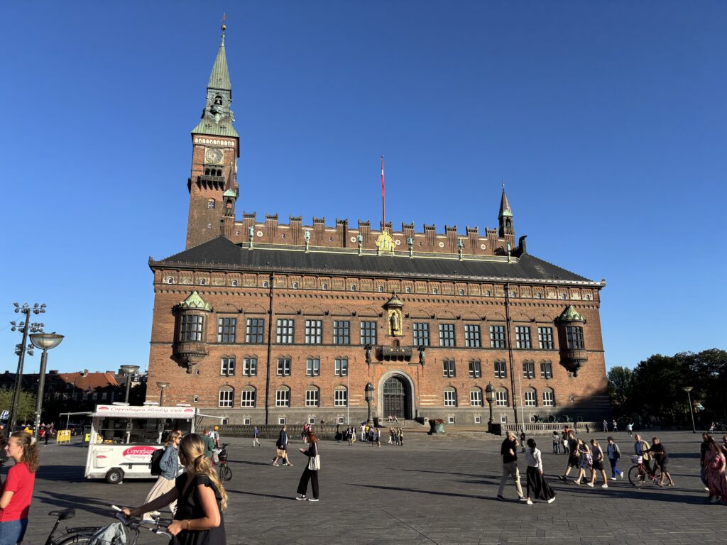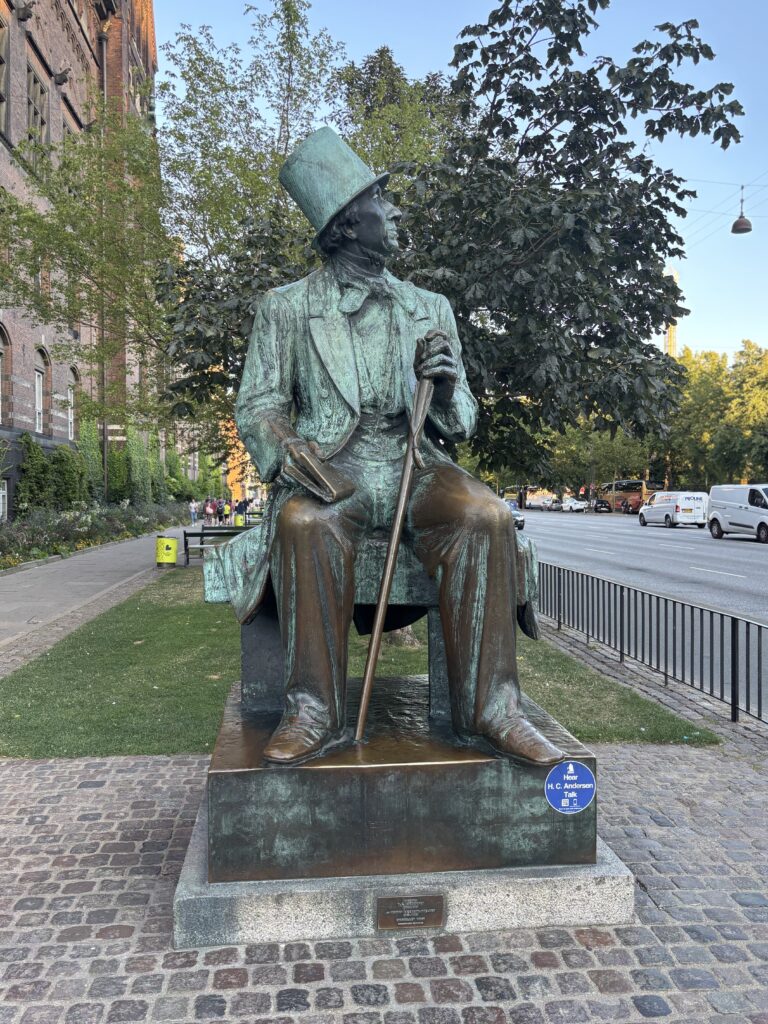 Znajdujemy się na placu ratuszowym – Radhuspladsen. Poza samym budynkiem otaczający nas plac nie zachwyca. Mnóstwo kostki i betonu. Obok Ratusza pomnik jednego z najbardziej poczytnych pisarzy duńskich , wspomniany wcześniej, Hans Christian Andresen. Twórca wspomnianej wcześniej Małej Syrenki czy też Calineczki.