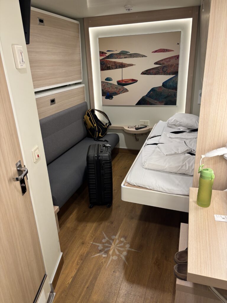 Odprawa trwa bardzo sprawnie. Po kilku minutach otrzymujemy klucze do naszej kajuty. Czeka nas zmiana czasu i wyborna kolacja na promie. Dobra, to wszystko ale w odwrotnej kolejności.