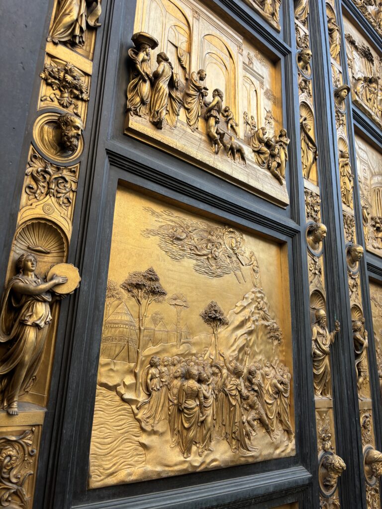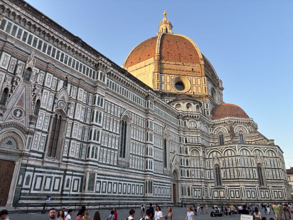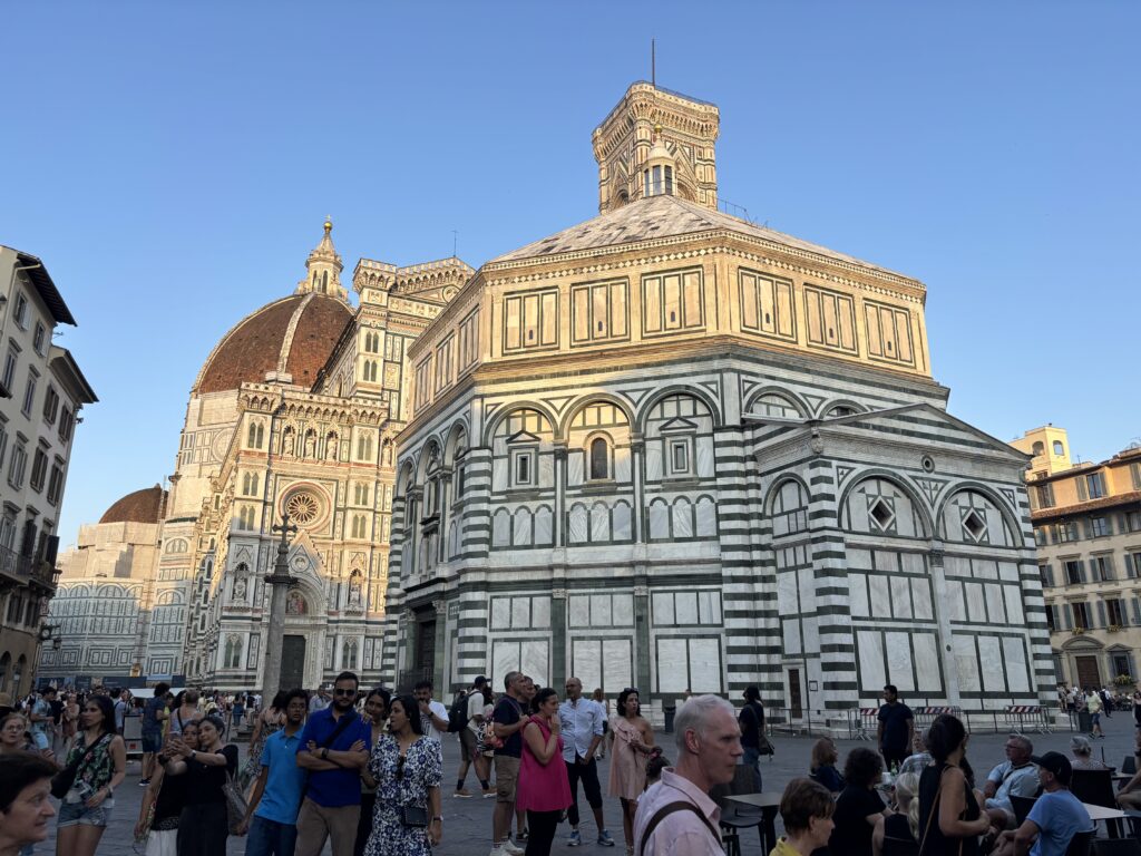 Dalej Borgo San Lorenzo dochodzimy do Baptysterium di San Giovanni. Piękne słońce oświetla ściany zabytkowych budynków. Zaraz za Baptysterium króluje chyba najbardziej znane Duomo na świecie. Katedra Santa Maria del Fiore. Katedra wypełnia Piazza del Duomo. Wrócimy na chwilę do Baptysterium i pięknych, ręcznie rzeźbionych drzwi.