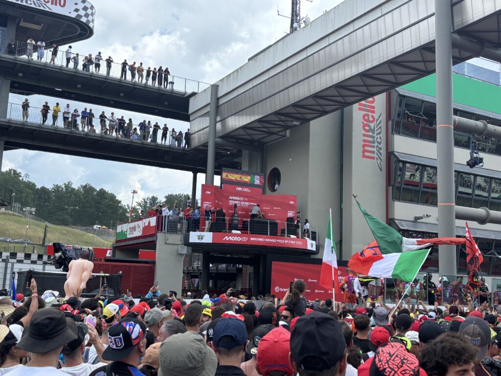 Spojrzenie na paddock jest bardzo interesujące. Tłumy kibiców celebrują wspólne święto. Dobry podkład muzyczny. Wygrywa M. Bezzecchi z zespołu Aprilia Racing. On świętuje najdłużej z kibicami.