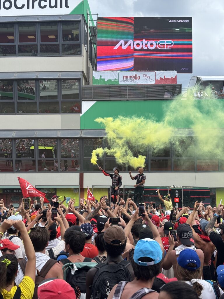 Skład wycieczki tym razem czteroosobowy, szefowa Ala, jubilat Pietro, Adaś i ja. Tym razem kwestie organizacyjne spadły na Alę, czyli lot – Wrocław – Bolonia, transfer wynajętym samochodem pod Florencję, gdyż tam mieliśmy wynajęty dom na prawdziwym toskańskim wzgórzu pośród rosnących dookoła oliwek i winogron. Bilety na MotoGP we własnym zakresie. Z ciekawostek trzydniowy karnet dla jednej osoby z możliwością transferu wokół toru bez miejsca stałego to 130 euro. Wszyscy gotowi. Motocykliści również. Dodam że jadąc do kraju gdzie motory są równie ważne jak calcio, spodziewałem się że będzie emocjonująco, kolorowo, nietuzinkowo ale na miejscu a szczególnie w niedzielę gdzie miały miejsce najważniejsze wydarzenia na torze czyli główne wyścigi kibice odpalili i fajnie było to wszystko skonfrontować z reakcjami piłkarskich kibiców. Jakie są wspólne cechy a jakie różnice. Z pewnością oddanie barwom klubowym jest podobne. Zdeklarowani kibice Marqueza, Peco Bagnaia czy Acosty wystrojeni w kolorowe, klubowe barwy. Flagi, czapeczki, koszulki, wszystko podobne. Zdecydowanie na plus fakt że obok spokojnie siedzieli kibice przykładów Marqueza i zespołu KTM. W piłkarskim wydaniu dość rzadki obrazek. Może poza naszym krajem jest tolerowane przywiązanie do innych barw klubowych. Niemniej, ciekawe spostrzeżenie socjologiczne. Jako że wszyscy poza Alą debiutowaliśmy na MotoGP, od piątkowych treningów i pierwszych kroków na torze w Mugello towarzyszyła nam euforia, podniecenie, wyczekiwanie czegoś niesamowitego, i pierwsze opary spalonego paliwa zaraz po starcie najsłabszej pośród trzech grup wyścigowych czyli Moto3 spowodowały że pojawiły się objawy gęsiej skórki. Na tor powoli przybywały kolejne grupy fanów. Ale spora już ich ilość stacjonowała już w miejscach przewidzianych dla namiotów czy camperów. Miasteczko motocyklowe również zaczynało żyć. Miejsca do zakupu Aperola, wina czy piwa, oczywiście bezalkoholowego, hmm, namioty zespołów startujących w wyścigach z Ducati czy KTM na czele, gdzie można było kupić praktycznie wszystko od długopisu po nawet skórzaną kurtkę. Dla prawdziwych kolekcjonerów istny raj. Moi współtowarzysze poczynili zakupy na stoisku Ducati, jeden z nich jest posiadaczem prawdziwego demona o nazwie Monster. Ja szukałem czegoś osobliwego, i ewentualny zakup zostawiłem na później. W obecnej sytuacji jedyny motor który chcę posiadać to Piaggio Vespa 125. I ten model skutera również tutaj był dobrze prezentowany.