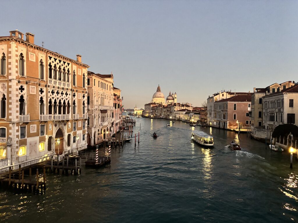 Ale za nim. Wsiadamy w pociąg do Wrocławia. Robert z synami jedzie z Poznania. Zabiera nas po drodze ze stacji Wrocław Stadion. Szybka wizyta w centrum handlowym. Odprawa. Jesteśmy na lotnisku we Wrocławiu kilka dni po wznowieniu lotów (przez miesiąc na lotnisku trwały prace mające usprawnić przede wszystkim wejście do strefy odpraw), i faktycznie są nowoczesne bramki, poza tym nic się nie zmieniło. Wsiadamy do samolotu. Synowie Roberta siedzą razem. Udało się to załatwić ze stewardessą. Lot krótki, nieco ponad godzinę. Transfer lotniskowy sprawdzoną linią www.Atvo.it, Piazzale Roma w Wenecji i zaczynamy swoją podróż. Wchodzimy do centrum od strony Dorsoduro. Mijamy restauracje w której kiedyś jadłem pyszną pastę z Julią. Wenecja za każdym razem jest inna. Niby te same kanały, ta sama woda ale jednak nawet sam fakt inaczej zachodzącego słońca sprawia że spojrzenie na nią jest inne. Dochodzimy do Ponte dell’Accademia. Po jednej stronie widzimy kopułę bazyliki della Salute, Santa Croce i Dorsoduro, budynki, kamienice dwóch dzielnic po drugiej stronie. Zaraz po minięciu mostu znajdujemy sympatyczną trattorię.