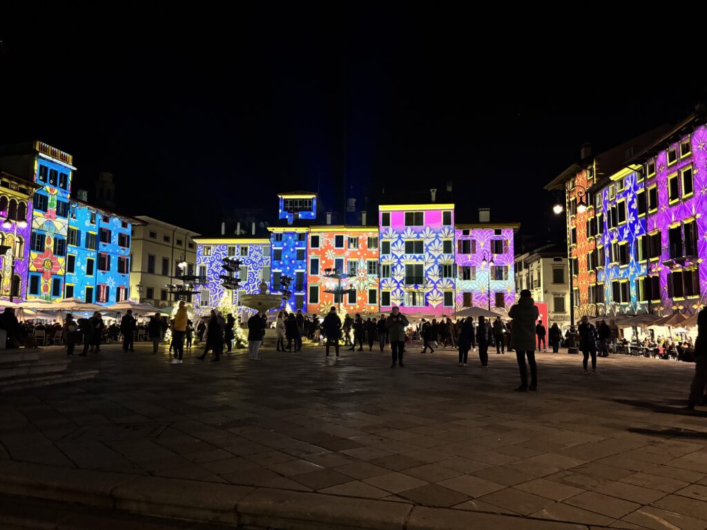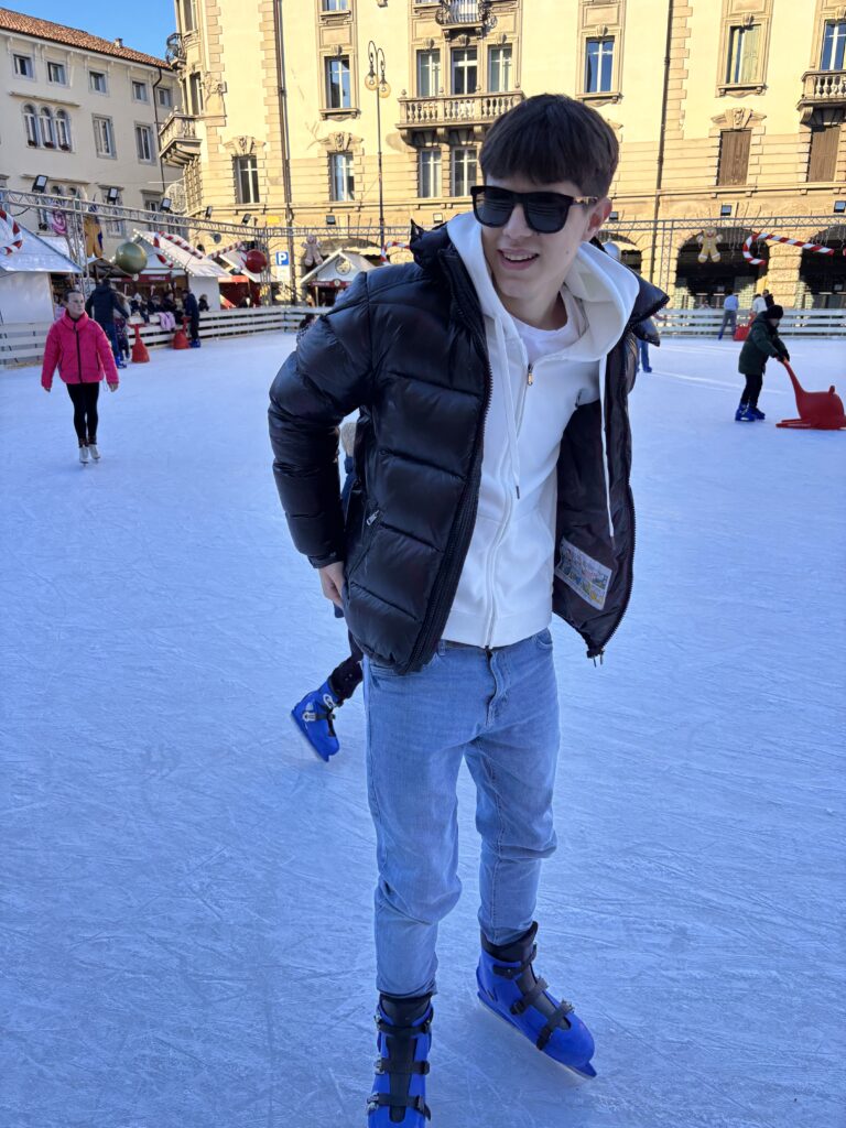 Castello Di Udine. Pięknie wyglądający zamek na wzgórzu z jeszcze piękniejszym widokiem na góry, miasto i najbliższe otoczenie. Czas na kawę. Zaraz po tym Robert z synami udają się do kościoła a my z Szymonem idziemy poszukać jakiegoś równie interesującego miejsca. Przypadkowo wpadamy na lodowisko przy Piazza XX Settembre. Bez chwili namysłu postanawiamy skorzystać z lodowej atrakcji i przyodziani w łyżwy wpadamy na lodowisko. Pierwsze kroki dość pokraczne ale po chwili suniemy po tafli jak zawodnicy NHL.