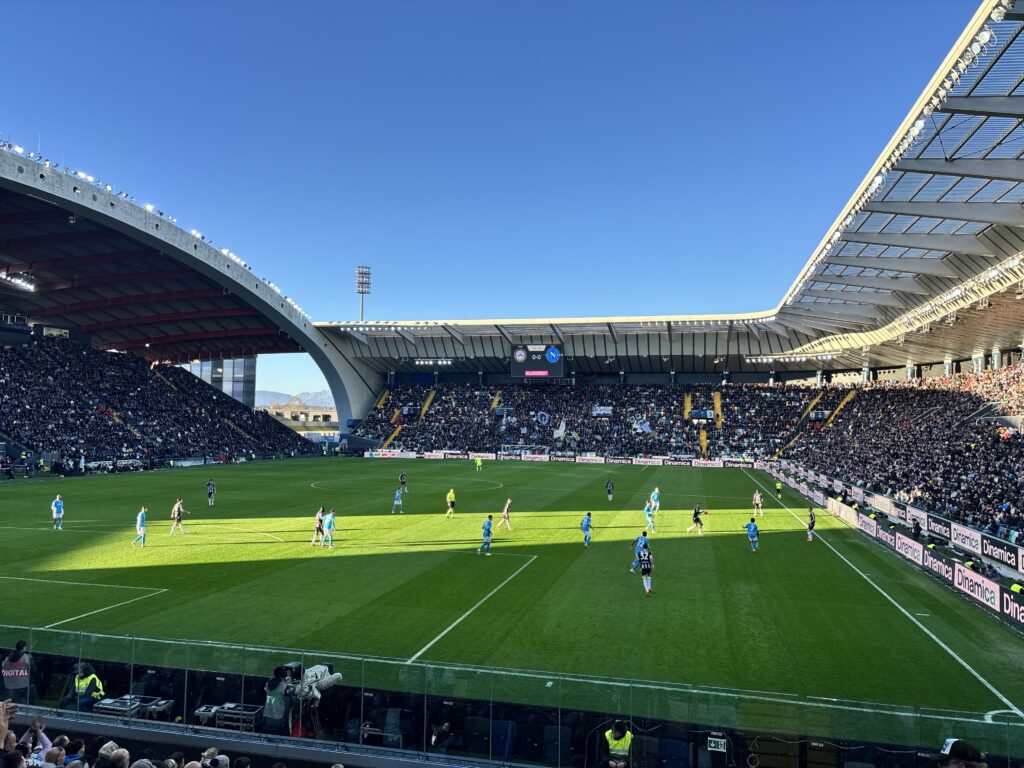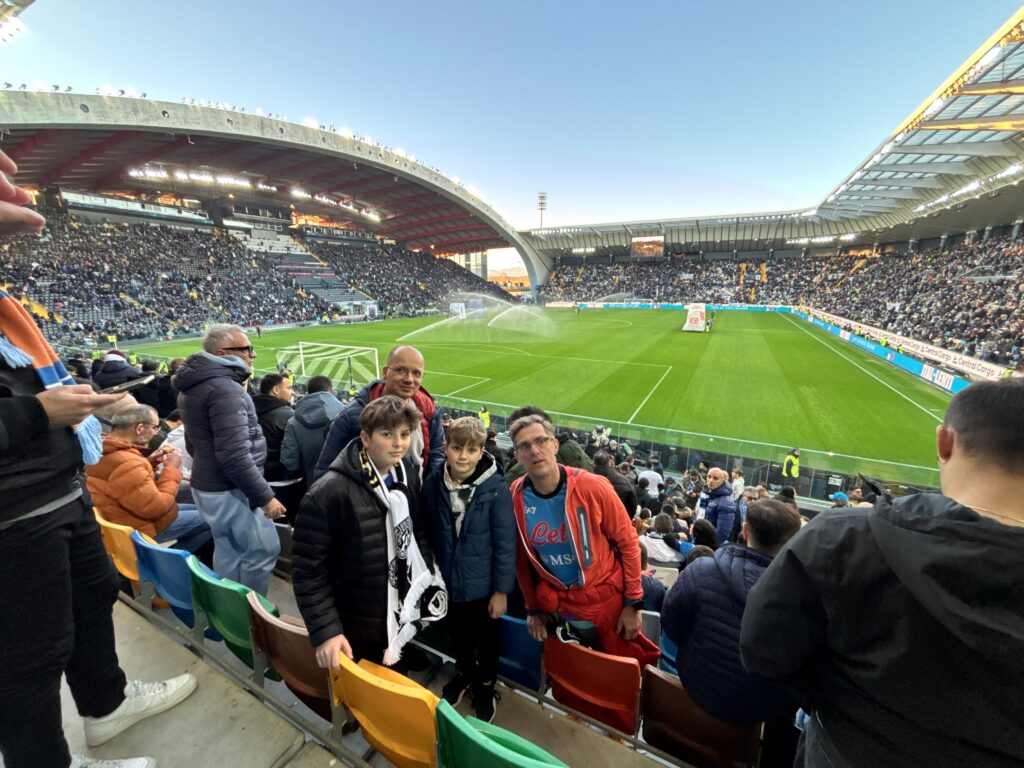 Rozkład jazdy na miejscu mówi zupełnie co innego. Nie tracąc czasu jedziemy autobusem na dworzec kolejowy. Tam pytam bardzo życzliwych carabinierów o możliwość dotarcia na stadion. Wskazują jeden z przystanków i linię numer 2. Chwila oczekiwania i docieramy prawie pod stadion. Wokoło mnóstwo samochodów. I sporo kibiców. Nie powinno nas to dziwić gdyż do Udine przyjeżdża aktualny jeszcze mistrz Włoch. Stoimy przed jedną z bram ale okazuje się że nasza trybuna jest po drugiej stronie. Czas ucieka. Sprint. Kontrola. Szymon nie ma dowodu. A bilet jest imienny. Muszę się przyznać że kontrolerów udało się zagadać i ostatecznie minutę po premierowym gwizdku meldujemy się na naszych miejscach. Szymon z chłopakami siedzą obok siebie, w centralnej części sektora a ja obok kilku Włochów. Poza sektorem dedykowanym kibicom Napoli pozostali, zdecydowana większość pozostałych też ubrana jest w barwy Napoli. Ja na sobie mam również koszulkę Napoli i jak się okaże mogę ją z dumą prezentować. Zarówno po jednej stronie jak i drugiej to mieszkańcy pobliskich miast i również kibicują Napoli. Marco, jeden z nich, mam brata w Polsce i pozwalamy sobie na wspólne zdjęcie, z pozdrowieniami i na dyskusję co do wydarzeń na boisku i nie tylko. Marco opowiada mi również o jednym z piłkarzy Udinese, Zaniolo, że gwizdy towarzyszące w momencie kiedy Zaniolo jest przy piłce nie są dziełem przypadku. Ogólnie, kolejna świetna lekcja włoskiego. Sam stadion kiedyś Stadio Friuli, poźniej Dacia Stadion, teraz BleEnergy Stadion jest jednym z nowocześniejszych jak na włoskie warunki. Oglądalność świetna. Super akustyka. Tylko gra Napoli jest rozczarowująca. Mistrz Włoch wyjeżdża z Udine z przegraną 1:0, a mogło być 3:0. Nieuznane dwa gole po weryfikacji var. Ale sama wizyta na stadionie i emocje plus wszystkie towarzyszące temu wydarzenia zostaną w pamięci na długo. Wychodzimy ze stadionu bez większego pośpiechu. Piękny obrazek na zakończenie. Mama tuli syna płaczącego po przegranej. No cóż. Hojllund i spółka musi się wziąć ostro do roboty aby myśleć o obronie mistrzowskiego tytułu.